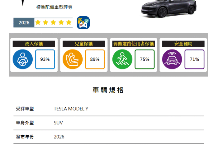 TNCAP執行機構公布評等結果 TESLA MODEL Y 獲得五顆星 CMC ZINGER 獲得零顆星